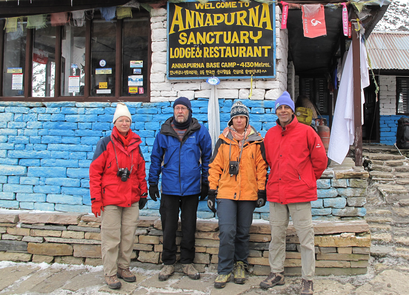 CLaude,Christian, KInou et JP à 4130m. Le panneau au dessus est en Anglais et en ...coréen (?)