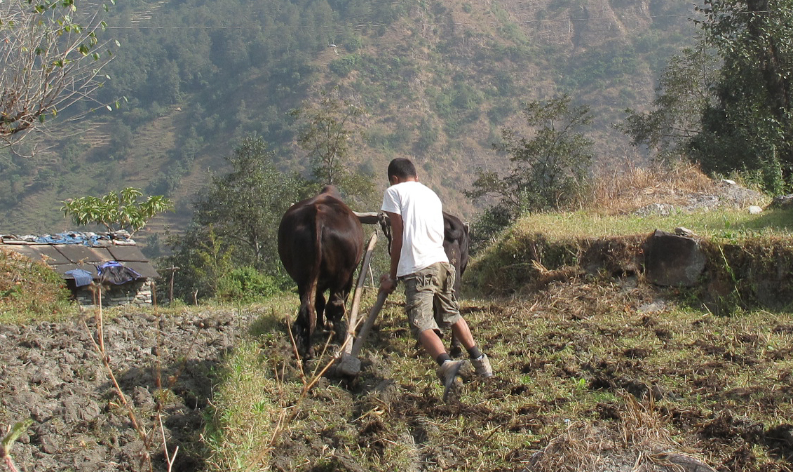 Baba, notre chef porteur emprunte l'arraire d'un paysan et nous fait une démonstation de labour. IL est lui-même agriculteur et complète ses revenus par le portage
