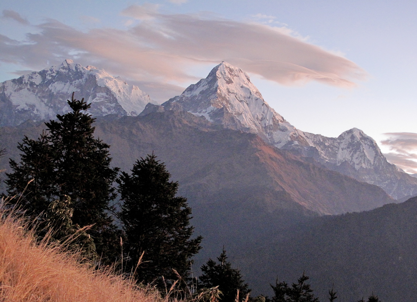 La chance est avec nous ( un chien noir nous a suivi) et le soleil se lève pour nous sur l'Annapurna ( à gauche) et le Macchhapuchhre ( 6997 m à droite)