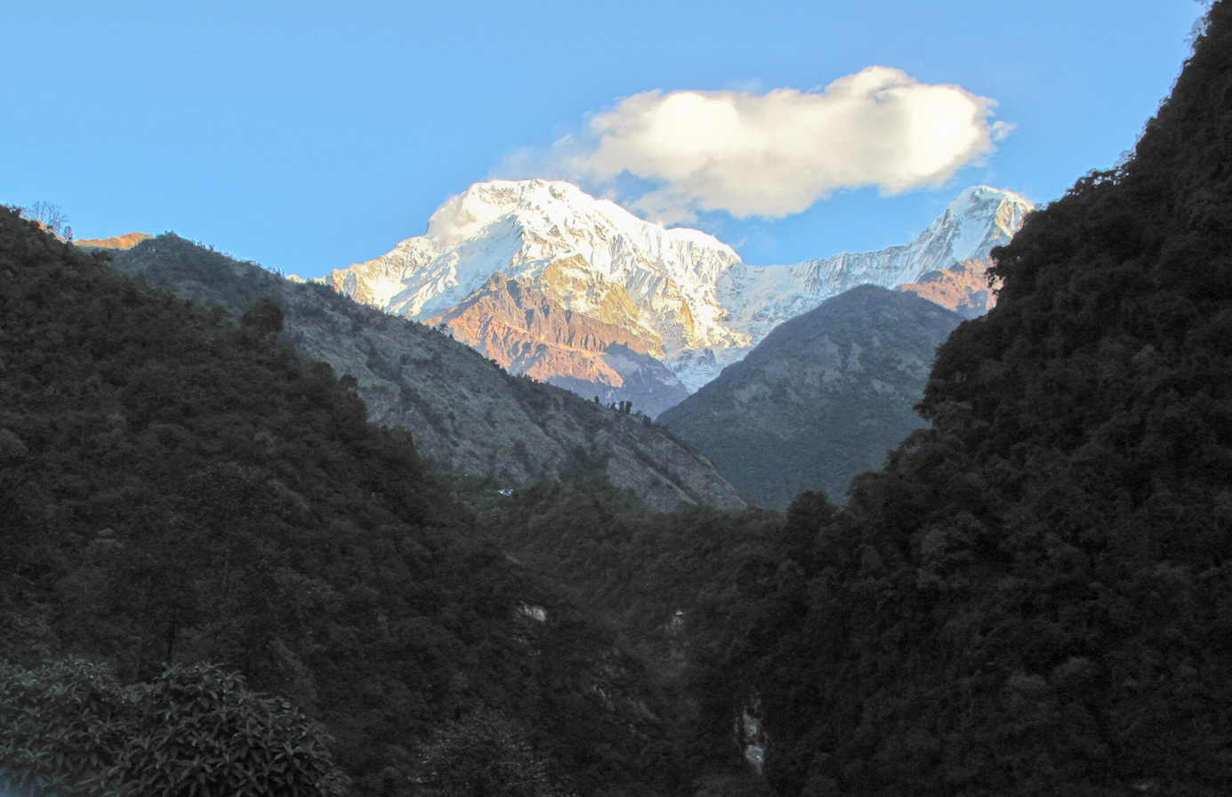 Vue hunchuli (6434) depuis newbridge. Il faut faire les photos à l'aube, car nes nuages sont toujours envahissants